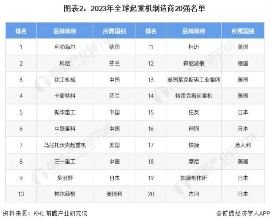 根據(jù)英國(guó)KHL集團(tuán)發(fā)布的2023年全球最大起重機(jī)制造商20強(qiáng)排行榜,德國(guó)的利勃海爾位居第一,其次是芬蘭的科尼、中國(guó)的徐工機(jī)械,整體來(lái)看,歐美品牌在全球起重機(jī)制造市場(chǎng)占據(jù)領(lǐng)先地位。