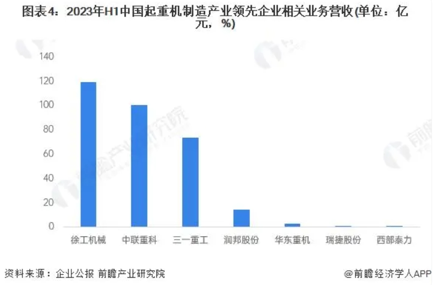 從國(guó)內(nèi)領(lǐng)先起重機(jī)企業(yè)經(jīng)營(yíng)規(guī)模來(lái)看,2023年上半年,徐工機(jī)械、中聯(lián)重科兩家企業(yè)的起重機(jī)業(yè)務(wù)營(yíng)收均超過(guò)百億規(guī)模,其次是三一重工的相關(guān)業(yè)務(wù)營(yíng)收超過(guò)70億元,與其它企業(yè)拉開(kāi)較大差距。